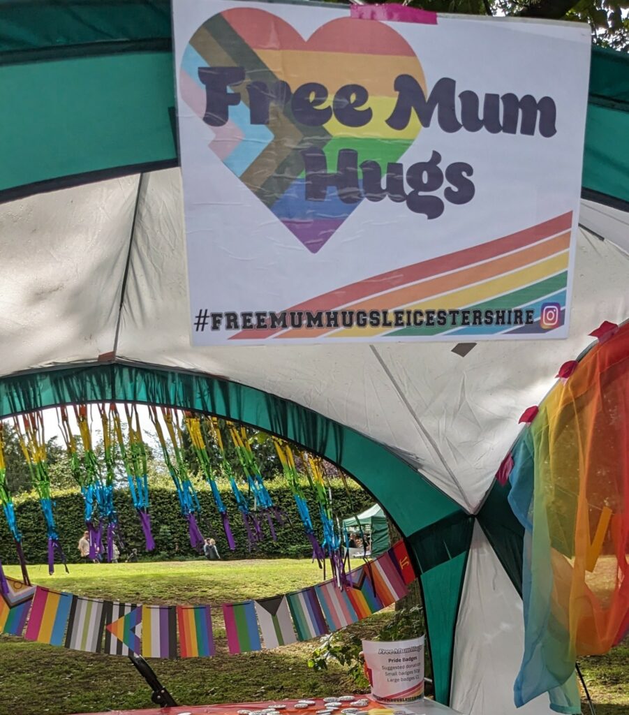 In 2023, we wanted to do more. So we looked at ways we could be more visible. We discovered that a town in Leicestershire was holding their first ever Pride march and celebration. It was extra special as this is the town that Kerry grew up in. She decided to take part and asked the organisers if she could set up a stand giving out Free Mum Hugs, and badges. Thats when our little pop up Hug spot was born.